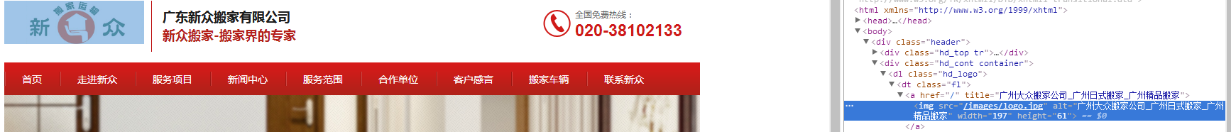 網(wǎng)站logo的alt標(biāo)簽和title標(biāo)簽都是調(diào)取的首頁TDK里面的標(biāo)題部分,這個(gè)需要修改下因?yàn)闃?biāo)簽只能體現(xiàn)出一個(gè)關(guān)鍵詞來而不是幾個(gè)隨意填寫的,我們把a(bǔ)lt標(biāo)簽關(guān)鍵詞設(shè)置為廣州大眾搬家公司然后在加上logo的H1標(biāo)簽注釋讓百度知道這個(gè)的重要性。