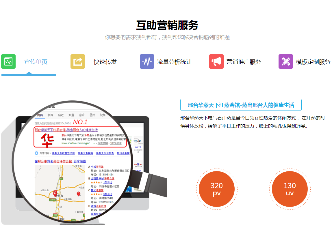 “搜到網(wǎng)”營(yíng)銷(xiāo)模板不同于傳統(tǒng)網(wǎng)頁(yè)模板,它是基于某一類(lèi)產(chǎn)品或某一種服務(wù)進(jìn)行的引導(dǎo)式創(chuàng)意設(shè)計(jì)而來(lái)的,我們的營(yíng)銷(xiāo)模板就是一個(gè)營(yíng)銷(xiāo)策劃方案,是設(shè)計(jì)師通過(guò)設(shè)計(jì)手法將產(chǎn)品或服務(wù)合理的展現(xiàn)出來(lái),便于引導(dǎo)用戶(hù)進(jìn)行數(shù)據(jù)的持續(xù)創(chuàng)建、持續(xù)傳播。